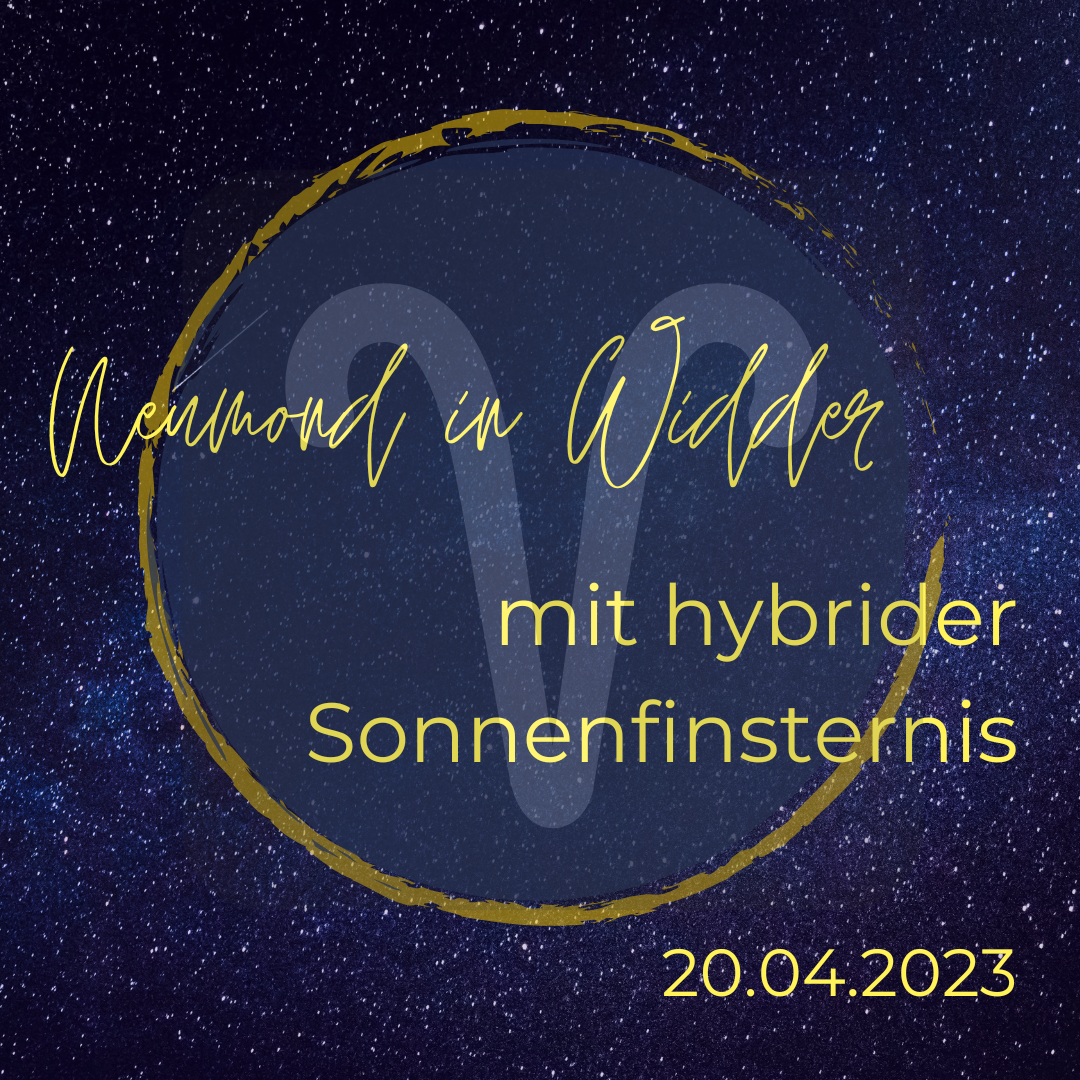 Nach dem Widder-Neumond im Monat März steht auch der Neumond im April im Feuerzeichen Widder. Wie immer bei Neumond stehen Sonne und Mond in Konjunktion, d.h. in enger Verbindung. Dieses Mal, am 20.04.2023 um 06:12 MESZ, treffen sich die beiden auf 29°50′ Widder und werden begleitet von einer hybriden Sonnenfinsternis, sichtbar in Australien und Südostasien, spürbar in ihren Auswirkungen auch in unseren Breitengraden.