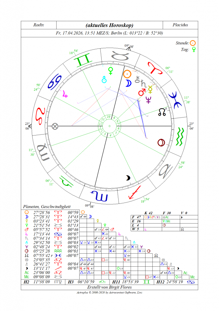Mars verleiht ab dem 09.04. einen besonderen Vorwärts-Schub, der gut genutzt werden kann, um Hemmnisse und Schwierigkeiten zu überwinden. Vorsicht vor allzu viel Elan. Die immense Feuerenergie kann auch ins Negative kippen.